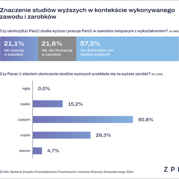 - Studia są postrzegane jako czynnik wspomagający, ale nie dominujący. Doświadczenie zawodowe i efektywność pracy wydają się kluczowe dla sukcesu finansowego, a wpływ edukacji jest najbardziej widoczny w branżach regulowanych i specjalistycznych - podkreśla Agnieszka Kozioł, dyrektor Departamentu Raportów i Analiz ZPF.