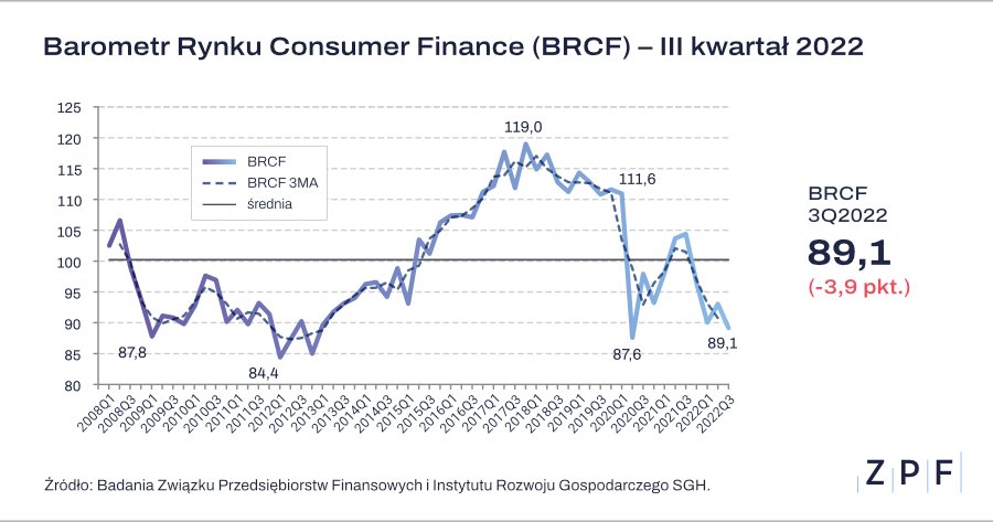 Wartość Barometru Consumer Finance spadła do 89,1 pkt. w III kwartale br. Aktualny odczyt jest niższy o 3,9 pkt niż ten zanotowany przed kwartałem, wynika z badania sytuacji na rynku consumer finance Związku Przedsiębiorstw Finansowych w Polsce (ZPF) i Instytutu Rozwoju Gospodarczego Szkoły Głównej Handlowej (IRG SGH). Kierunek wskazań BRCF, pomimo poprawy zanotowanej w poprzednim badaniu, może oznaczać spowolnienie dynamiki akcji kredytowej w okresie kilkunastu kolejnych miesięcy.
