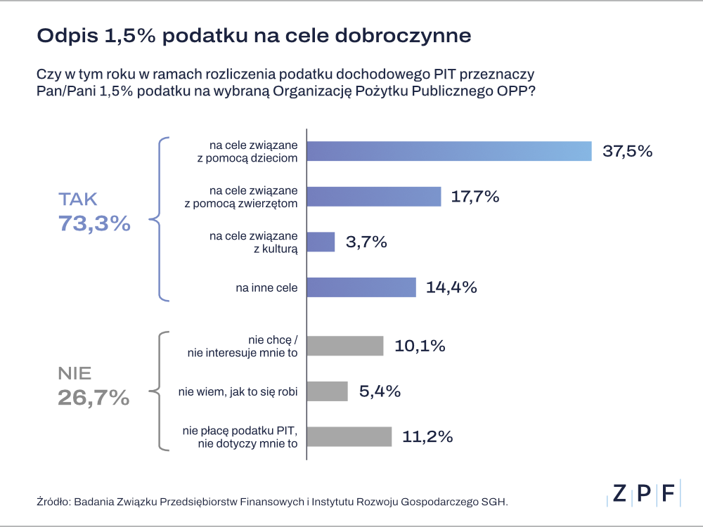 Gotowość do przekazywania odpisu pozostaje w tym roku wysoka i relatywnie stabilna. W badaniu ZPF i IRG SGH 73,3 proc. ankietowanych zadeklarowało, że rozliczając w 2026 r. PIT za 2025 r., będą pamiętać o wskazaniu organizacji, która dostanie 1,5 proc. ich podatku. Podobne wyniki odnotowano w latach ubiegłych (74,5 proc. w 2025 r. oraz 74,7 proc. w 2024 r.).