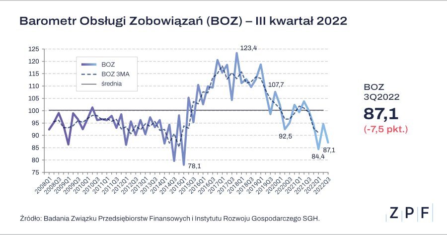 Według najnowszych badań ZPF i SGH, Barometr Obsługi Zobowiązań (BOZ) spadł do poziomu 87,1 pkt. w III kwartale 2022 r. do poziomu 94,6 pkt. Wartość BOZ pozostaje w obszarach pesymistycznych, poniżej 100 punktów i jest w trendzie spadkowym.