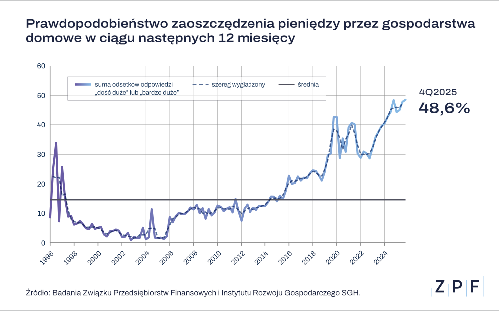 Z danych ZPF i IRG SGH wynika, że saldo prognozy oszczędzania wyniosło w IV kwartale 2025 r. -1,0 pkt. (w porównaniu z -2,5 pkt. poprzednio i -0,1 pkt. przed rokiem), wskazując na stopniowy wzrost optymizmu gospodarstw domowych w perspektywie najbliższych dwunastu miesięcy.
