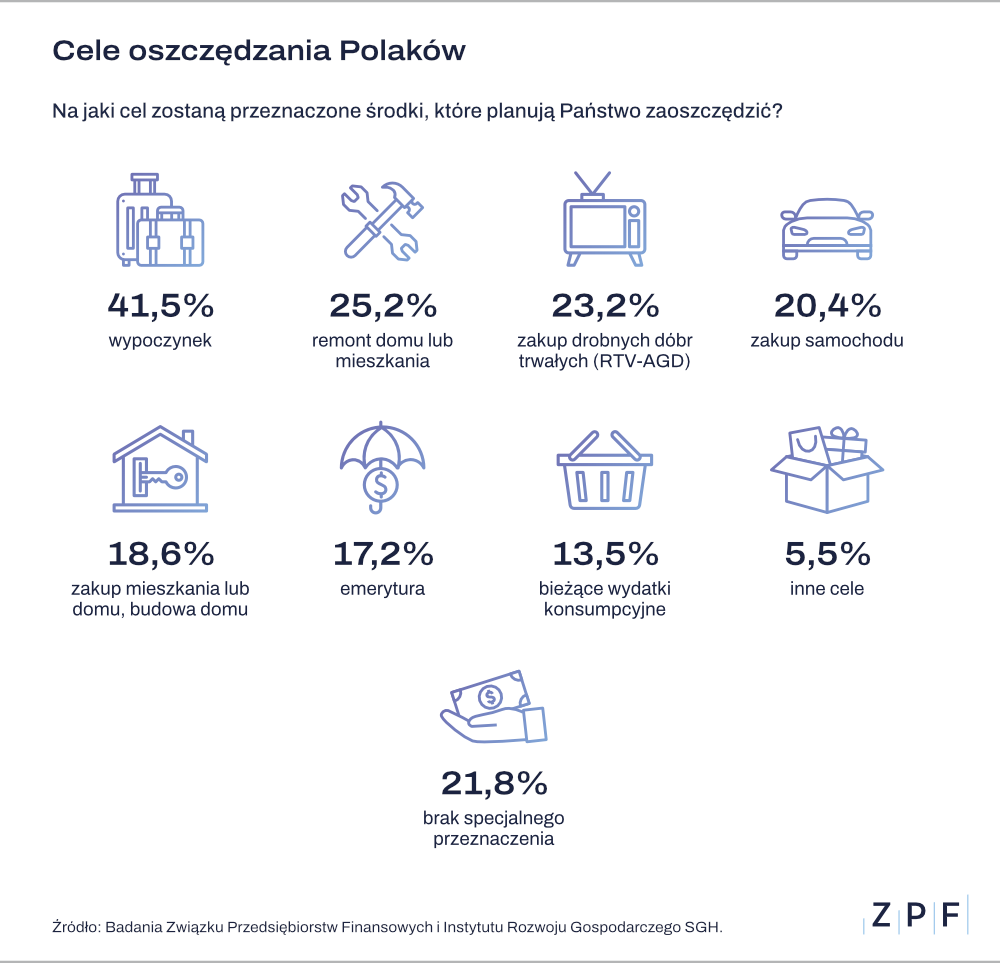 Dane ZPF i IRG SGH pokazują, że wypoczynek jest najczęściej deklarowanym celem oszczędzania, choć gospodarstwa domowe dywersyfikują przeznaczenie odkładanych środków, uwzględniając również inne potrzeby.