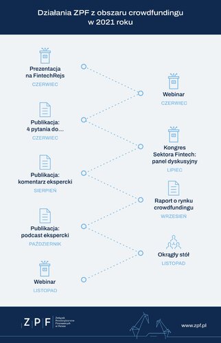 W ramach akcji, przygotowanej przez ZPF wspólnie z przedstawicielami branży finansowania społecznościowego, przeprowadzonych zostanie szereg działań edukacyjnych i informacyjnych na temat tej innowacyjnej formy inwestowania i pozyskiwania kapitału na rozwój. Na przestrzeni najbliższych 6 miesięcy zaplanowano m.in. dwa webinary, trzy publikacje eksperckie, a ponadto prezentacje i panele podczas wydarzeń branżowych. W przygotowaniu jest również raport prezentujący aktualną sytuację na rynku crowdfundingu w Polsce. Punktem kulminacyjnym akcji będzie „Okrągły stół” branży crowdfundingowej, który odbędzie się w listopadzie 2021.