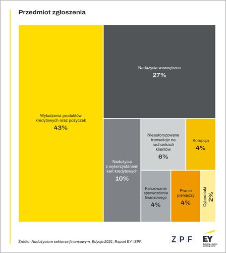 Najczęściej zgłaszanymi przez sygnalistów typami nadużyć były wyłudzenia produktów kredytowych i pożyczek oraz nadużycia wewnętrzne - były one przedmiotem zgłoszenia w aż 43% przypadków. Ciekawe jest natomiast to, że w badaniu z 2020 r. tylko 4% respondentów wskazało na nadużycia wewnętrzne jako na przedmiot zgłoszenia – w tym roku zaś, aż 27%. W ocenie autorów badania tak zauważalny wzrost nie wynika jedynie z rzeczywistego wzrostu tego typu nadużyć w organizacjach, głównie wskazuje na zwiększenie się poziomu świadomości pracowników i ich zaufania do pracodawcy.