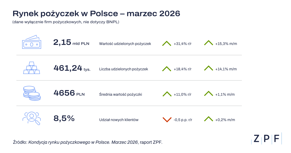 W marcu 2026 r. instytucje pożyczkowe udzieliły finansowania o wartości 2,15 mld zł, co oznacza wzrost o 31,4 proc. rok do roku – wynika z danych ZPF i CRIF. Sektor nadal koncentruje się na jakości portfela i utrzymuje wysoką selektywność w ocenie klientów.