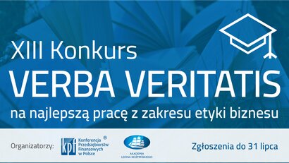 Do 31 lipca br. przyjmowane są zgłoszenia do konkursu VERBA VERITATIS, organizowanego już po raz trzynasty przez Konferencję Przedsiębiorstw Finansowych oraz Akademię Leona Koźmińskiego. Na autorów najlepszych prac z zakresu etyki biznesu czekają nagrody pieniężne o łącznej wartości minimum 6 tys. zł. ...